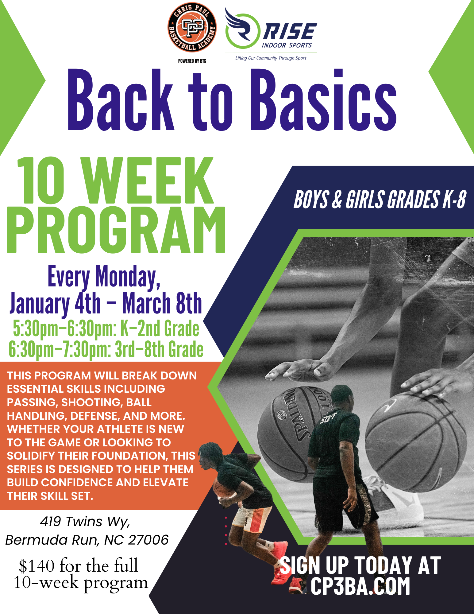 RISE Indoor Sports, featuring CP3 Basketball Academy, is excited to present the 10-Week Back to Basics Skills Program — the perfect opportunity for athletes to sharpen their fundamentals and start the year strong.