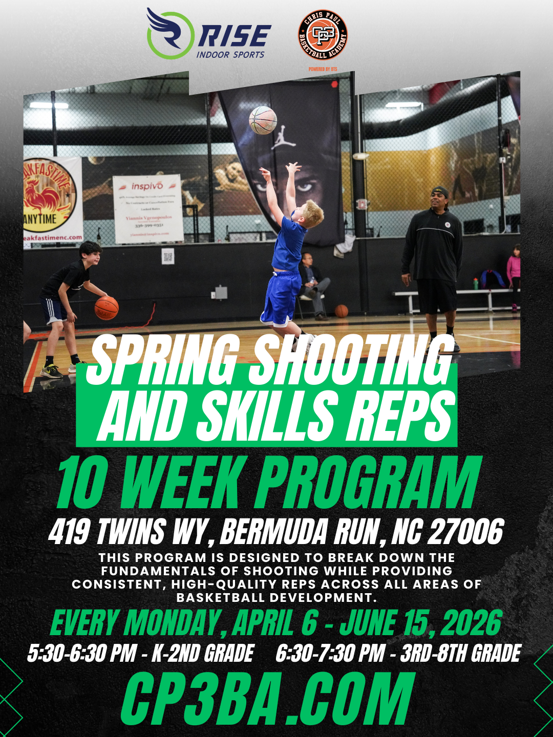 RISE Indoor Sports, in partnership with CP3 Basketball Academy, is excited to announce our second 10-Week Program- Spring Shooting & Skills Reps Program.